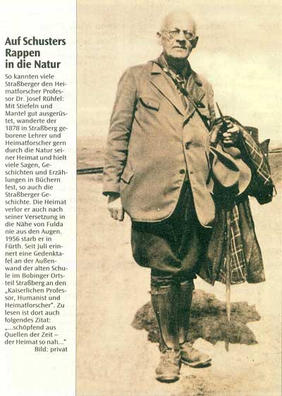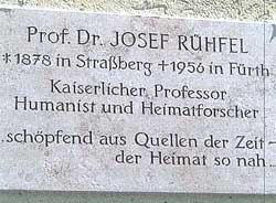 Den Berichten zufolge taute der sonst sehr strenge Lehrer in der Natur seiner Heimat stets völlig auf. Er sei hier stets gelöst, lustig und viel aufgeschlossener als im Alltag gewesen. Dies kann auch die Nürnbergerin Rosita Gabler, eine Enkelin Rühfels, bestätigen, die ihren Großvater oft besuchte: "In seiner Wohnung war alles voller Bücher, diese Atmosphäre empfand ich als Kind als sehr erdrückend. Er war sehr streng, doch die Natur machte aus ihm einen anderen Menschen". Um 1920 verfasste Prof. Dr. Rühfel die "Geschichte des Dorfes Strassberg bei Augsburg". Im Vorwort des Buches erzählt der Heimatforscher von seiner Absicht "die Gegend zwischen Wertach und Schwarzach, ungefähr von Wellenburg bis Guggenberg, in einer Reihe von Einzelarbeiten zu schildern". Das diesem Werk zugrunde liegende archivarische und literarische Material aus der Zeit Josef Rühfels, das die Lebensverhältnisse der Menschen und deren natürliche und geografische Grundlage beschreibt, macht dieses Buch zu einem heimatkundlichen Schatz. Ein Zitat daraus liegt Bürgermeister Bernd Müller besonders am Herzen, wie er in seiner Rede betonte: "Ich habe gelernt, was Heimat heißt, und darin einen Schatz gefunden, der mich reich macht und in dessen Besitz ich nie wieder arm werden kann".